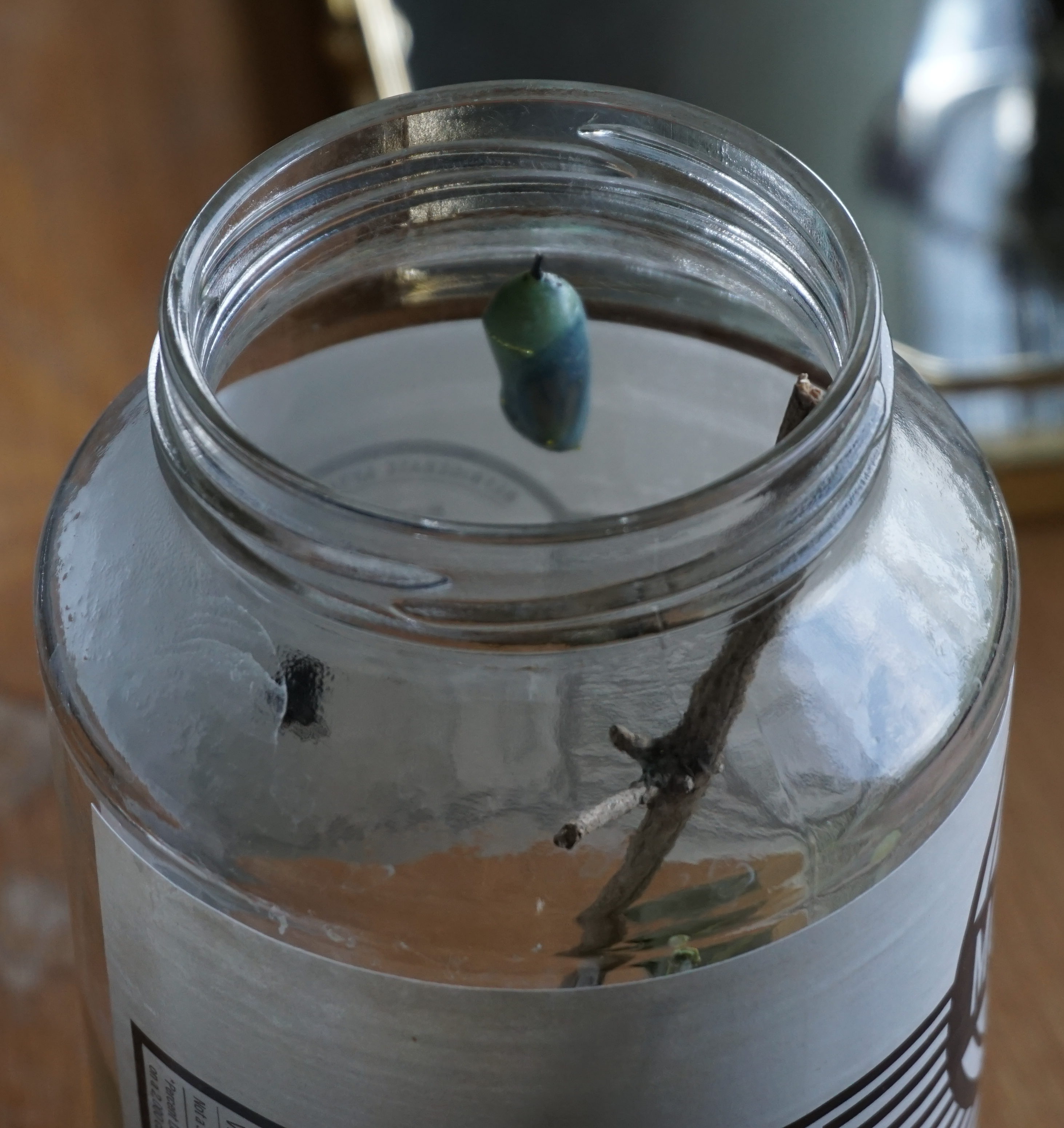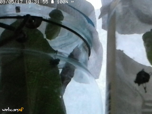 Updates: 9/5 - In less than an hour, one caterpillar formed its chrysalis, and the second quickly followed suit. They leave their heads outside the chrysalis – I’ll leave them there in case they want them once they come out. Repositioned camera. Now we wait.